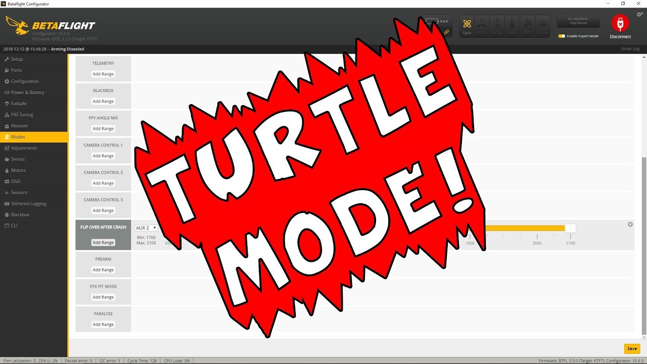 Примечание. В последних релизах Betaflight режим «черепахи» (Turtle mode) был переименован в режим Flip Over After Crash («Переворот после крушения»), однако многие люди по привычке называют его режимом «черепахи».