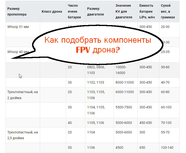 Таблица компонентов для FPV-дрона: размер двигателя и пропеллера, KV, число секций аккумулятора и вес БПЛА