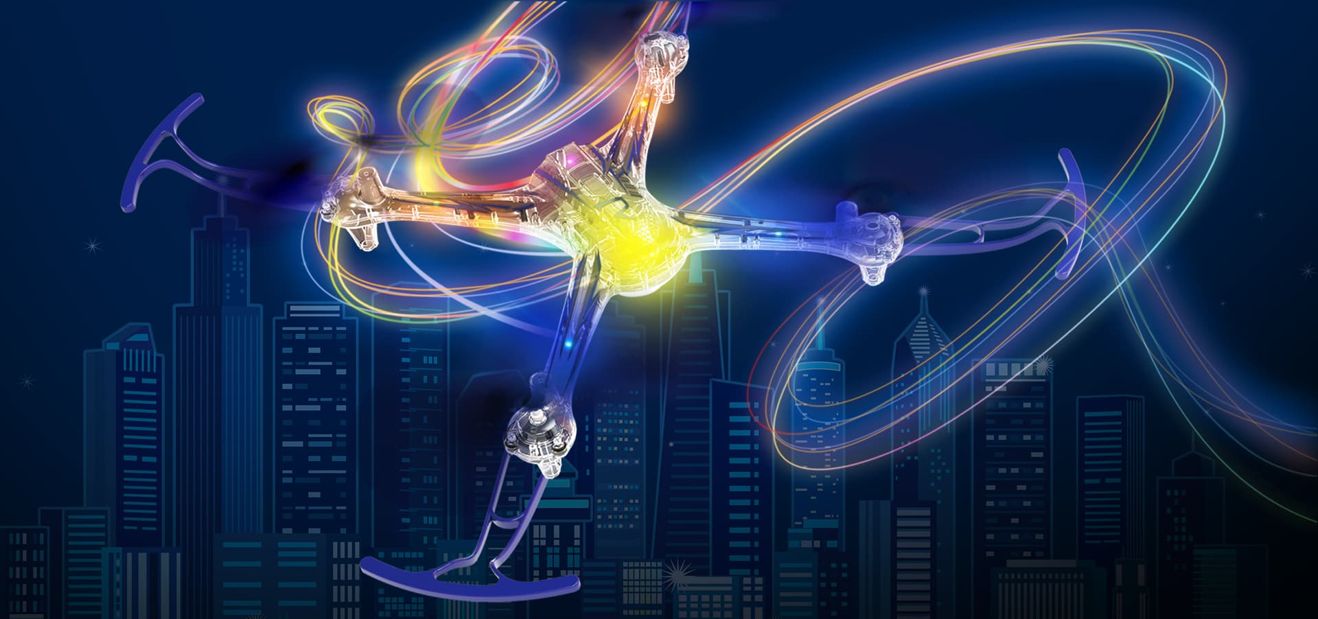 - Четыре канала управления предоставляют возможность управления дронов во всех направлениях: вверх/вниз, вперёд/назад, влево/вправо, вращение.
